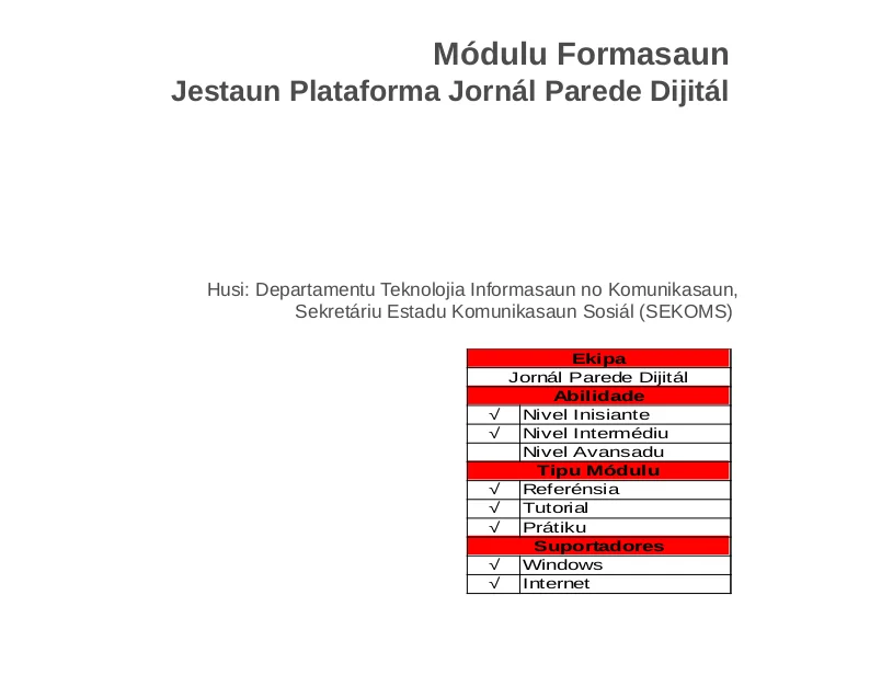 Módulu formasaun “Jestaun Plataforma Jornál Parede Dijitál” ida-ne’e destina ba profesór/a no jestór eskola ne’ebé hakarak aprende oinsá atu uza plataforma Jornál Parede Dijitál eskola hodi publika perfíl eskola nian, atividade aprendizajen sira, no publika produtividade estudante atraves plataforma ne’e.